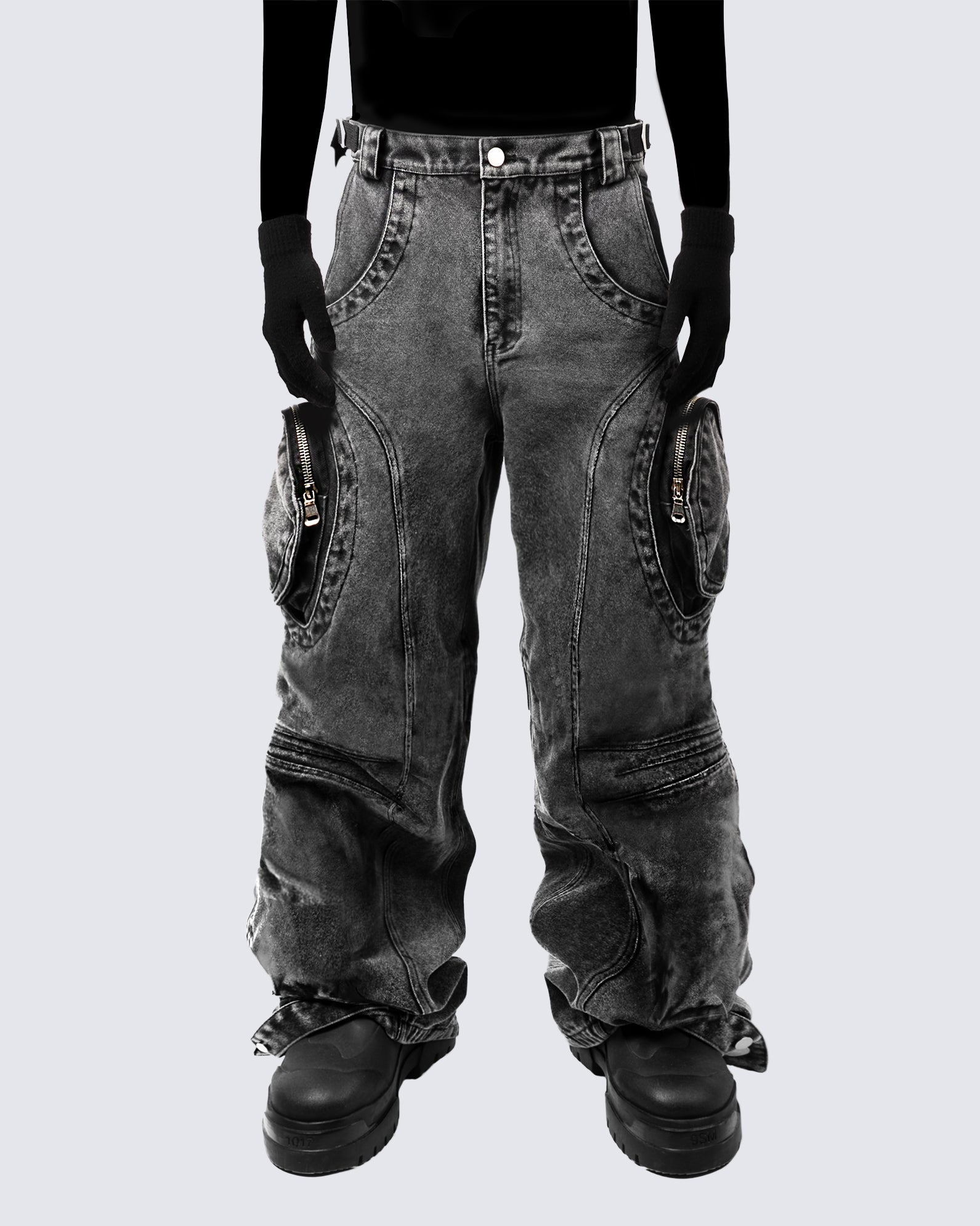 These jeans combine unique design with comfort, blending street style and avant-garde fashion. Perfect for those seeking individuality and trendiness.